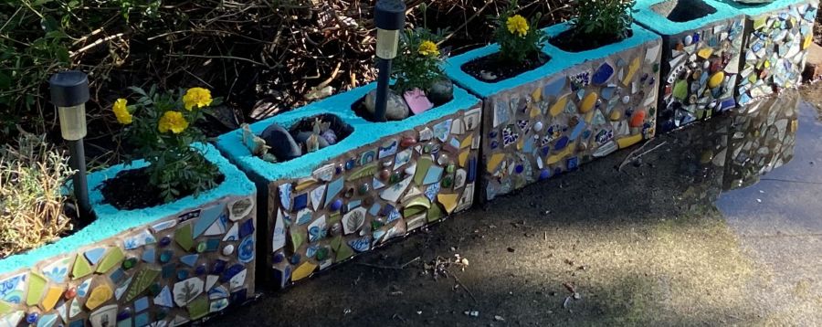 I've always loved yard art made of cinder blocks. These are two of my first four mosaic planters, which as close as I can figure, I made sometime in 2021 (see below). I wanted to experiment with broken pottery and other "found" tesserae, and I was happy with how they turned out. This was April …